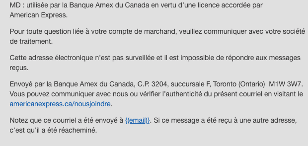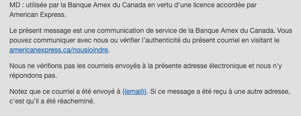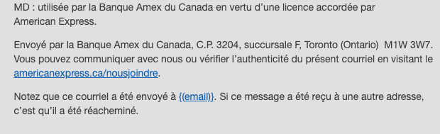 Envoyé par la Banque Amex du Canada, C.P. 3204, succursale F, Toronto (Ontario) M1W 3W7. Vous pouvez communiquer avec nous ou vérifier l’authenticité du présent courriel en visitant le americanexpress.ca/nousjoindre.